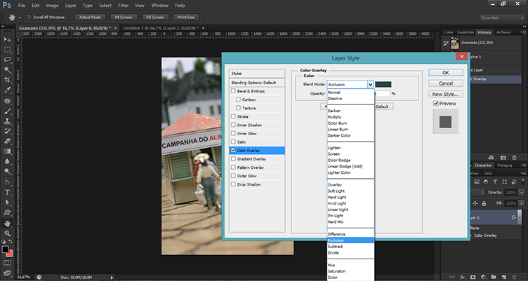 3) Em Blend Mode deixe na opção Exclusion e a opacidade entre 10% a 30%.